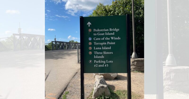 本日のメインは”テラピン・ポイント”からナイアガラの滝を楽しむこと。小さな橋の手前に看板が設置されていました。どんな景色なのかしら?楽しみですねぇ〜。