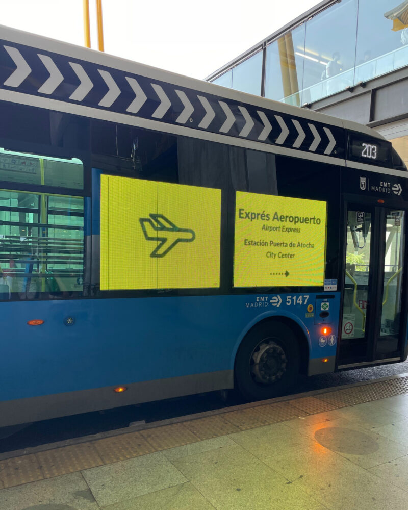 アトーチャ駅からはバスでアドルフォ・スアレス・マドリード=バラハス空港へ向かいます。海外の空港って通称があったり面倒なんです。同じ都市に複数空港があったりするので、確認は慎重にしなければなりません。まちがって違う空港に行ったら大変ですからね。